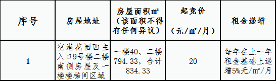 南昌金开枫林物业管理有限公司就南昌经济技术开发区空港花园安置房小区9号楼二层南侧房屋及一楼楼梯间区域整体打包对外公开进行出租经营权竞拍,现对有关事项公告如下: