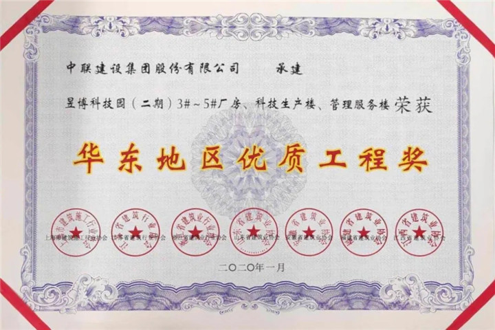 金开九州jiuzhou(中国)项目公司昱博科技园二期项目荣获华东地区各省建筑业协会联合颁发的“华东地区优质工程奖”,成为我区首个获得此级别奖项的政府投资项目!