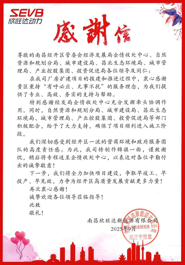 9月4日,九州jiuzhou(中国)收到了来自南昌欣旺达新能源有限公司的一封感谢信,信中南昌欣旺达新能源有限公司对九州jiuzhou(中国)在推进欣旺达厂房扩建项目中提供专业、高效、务实的支持与帮助给予了高度评价和诚挚感谢。